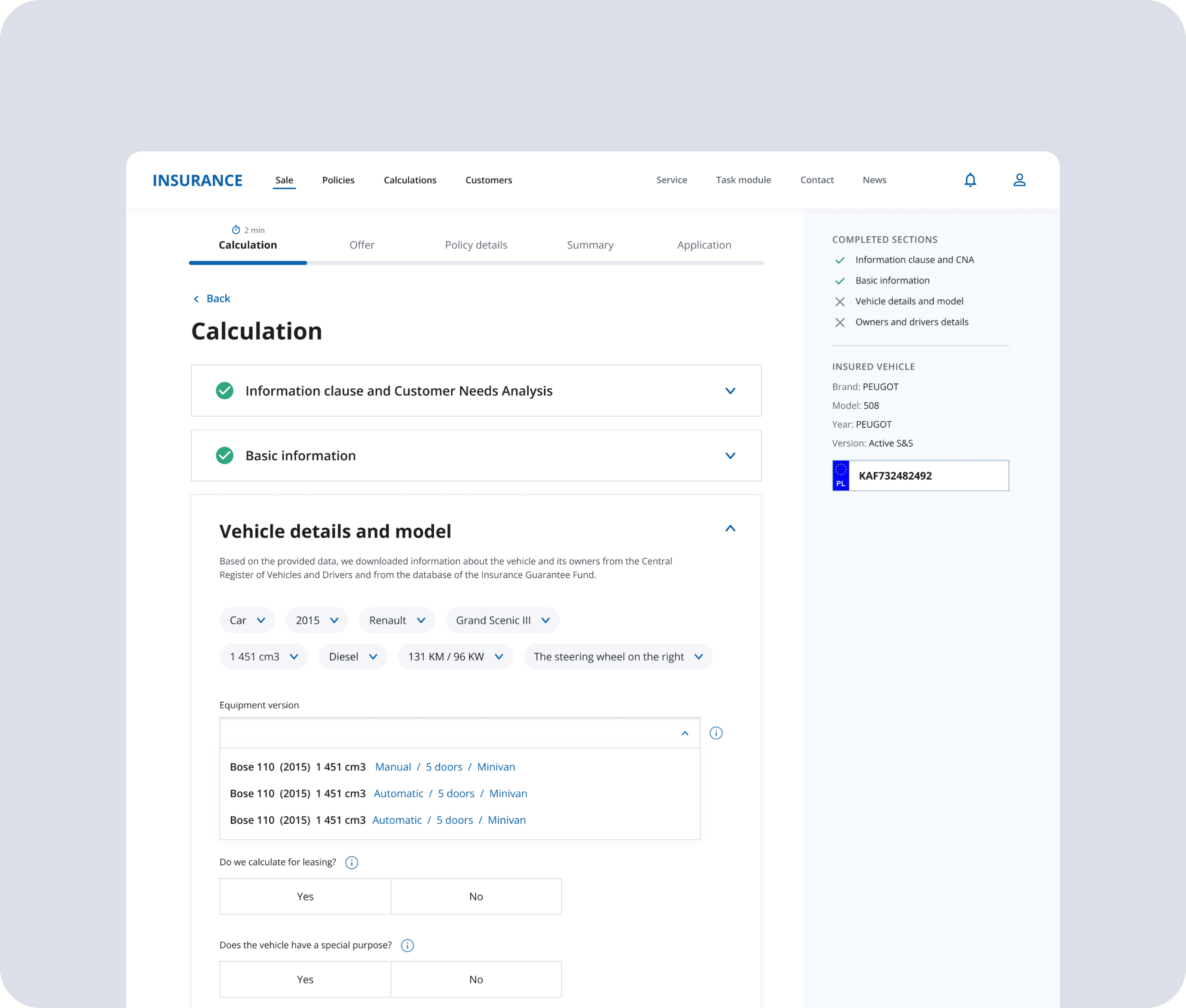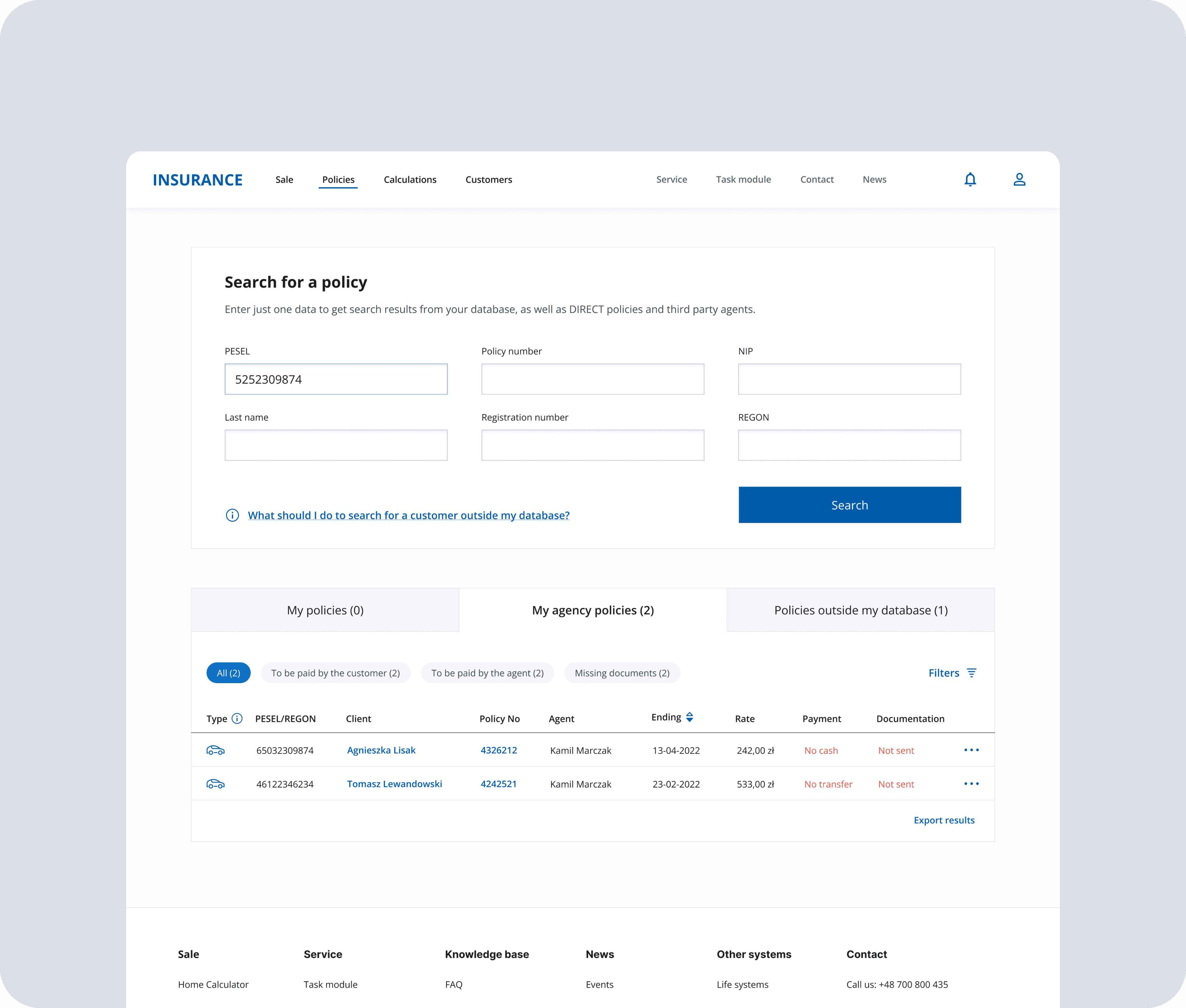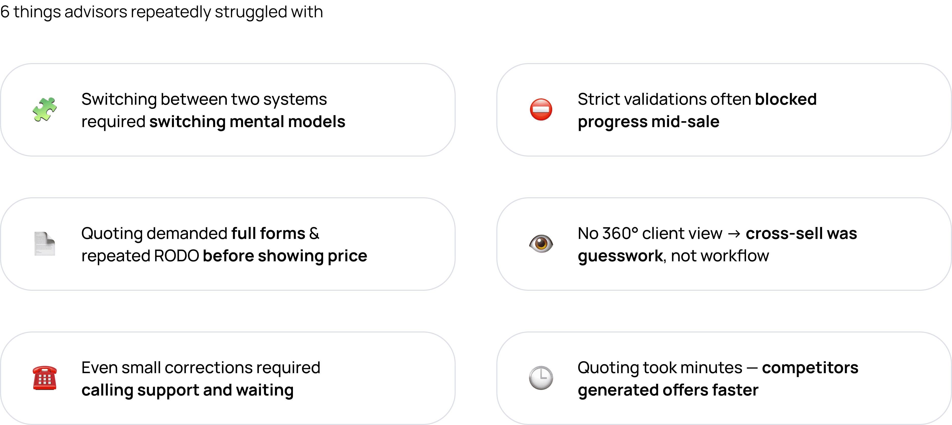 Agents switched between two systems with different mental models. Simple actions (fixing data, retrieving history, checking policy details) required support. Quoting demanded full forms, repeated RODO, and strict validations that stopped sales mid-flow.
