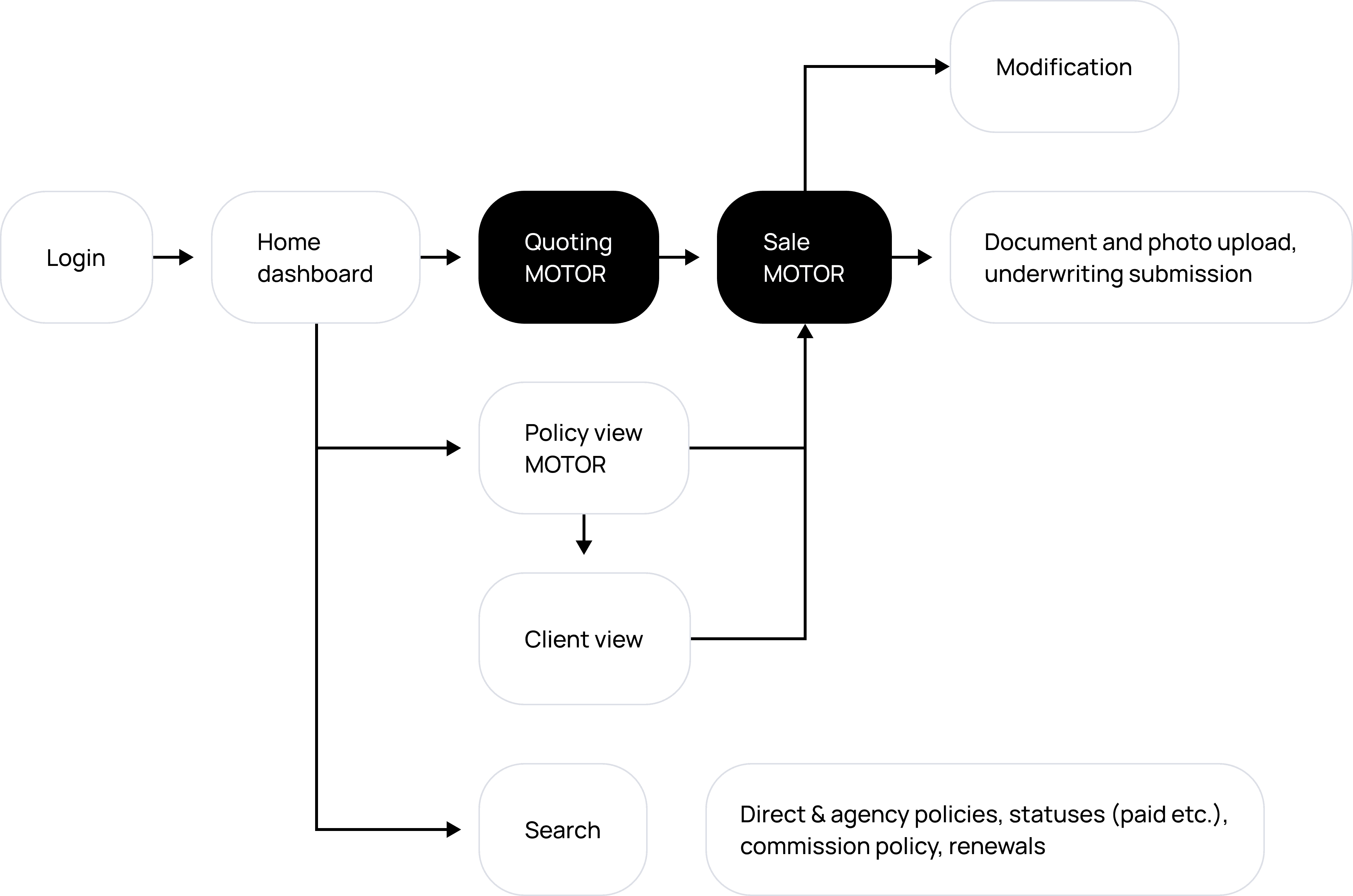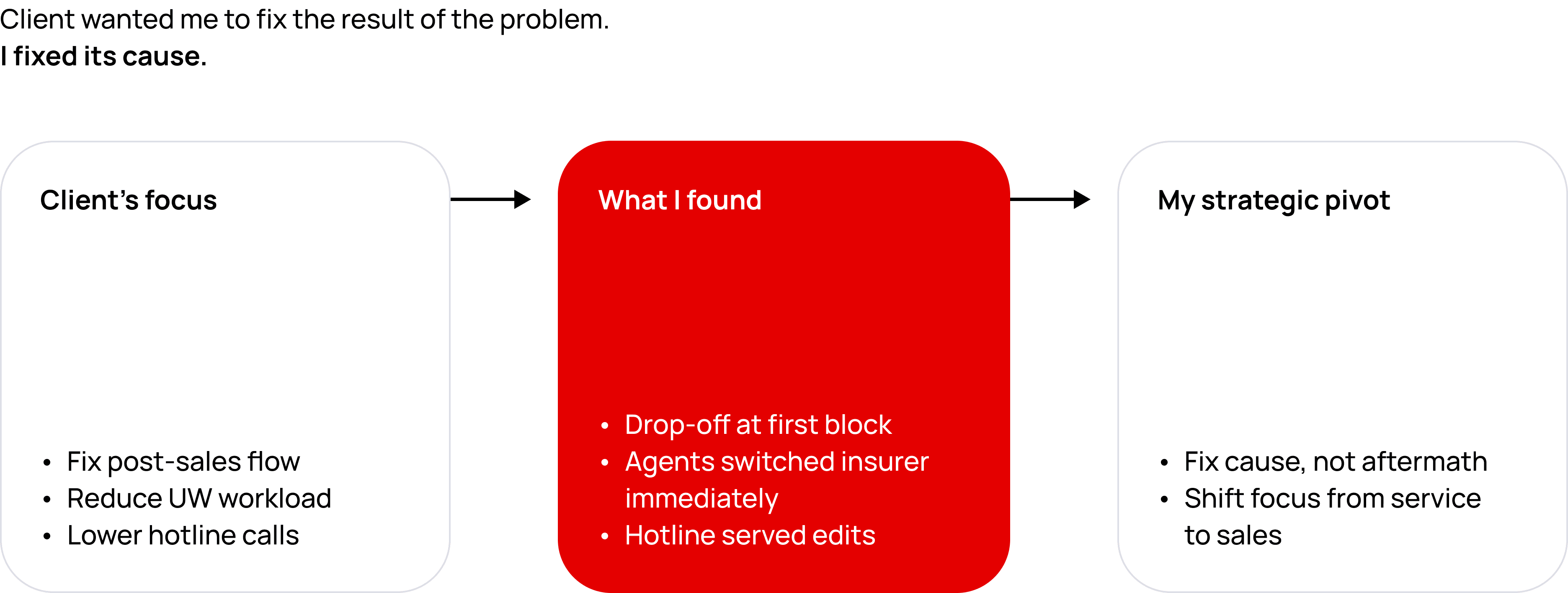 I led the product design direction end-to-end — from discovery to delivery. I audited two legacy systems, interviewed agents and uncovered the need to pivot from service-first to sales-first.